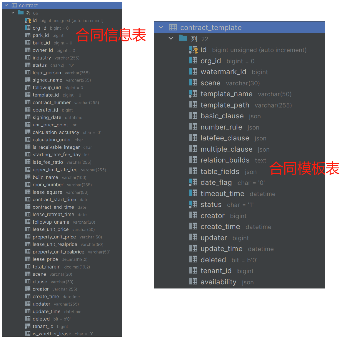 `scene` varchar(30) CHARACTER SET utf8mb4 COLLATE utf8mb4_unicode_ci DEFAULT NULL COMMENT '合同类型/合同应用场景;普通租赁合同(normal)/退租合同(retreat)/物业合同(property)等等 多个用英文逗号连接',