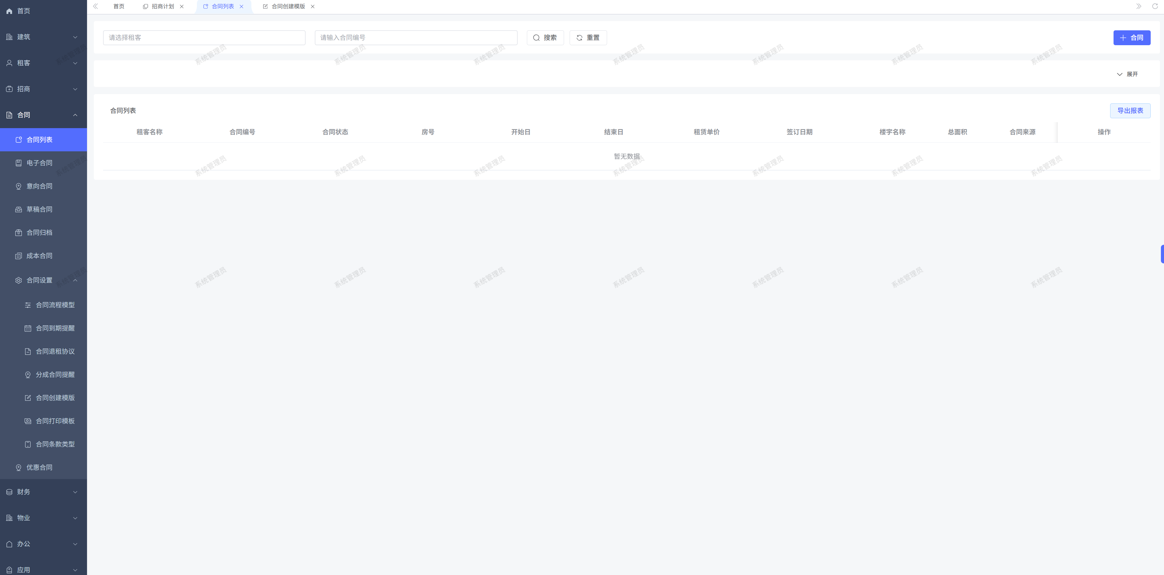 合同模块,由 xcmd-module-asset 后端模块的 contract 包实现,主要有合同列表、合同模板等功能。如下图所示: