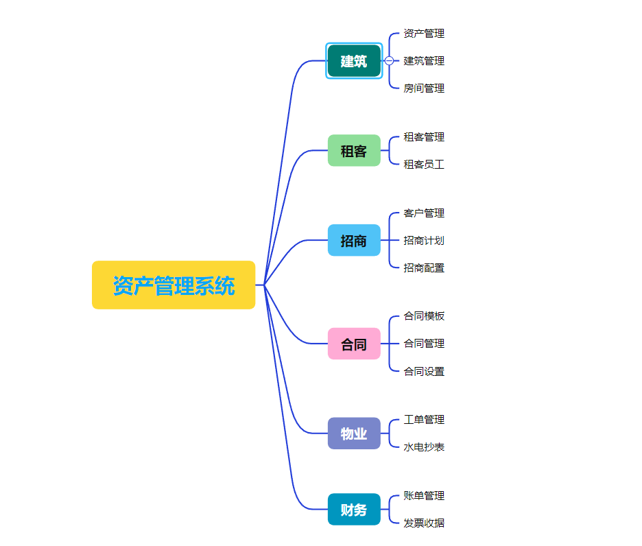 主要分为 6 个核心模块:建筑、租客、招商、合同、财务、物业。