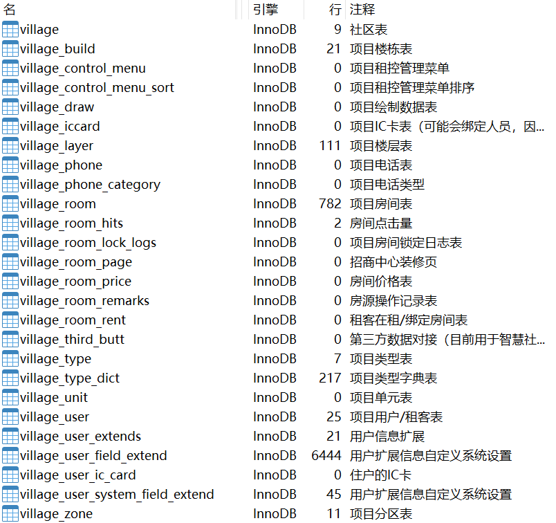 以 village_ 作为前缀的表,表结构如下: