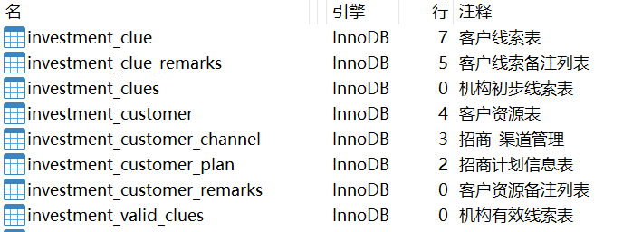 以 investment_ 作为前缀的表,表结构如下: