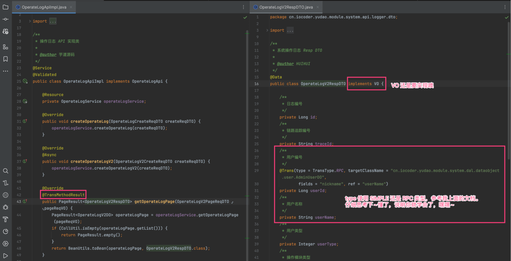 ② 第二步,给 OperateLogRespVO 的 deptId 字段,添加 @Trans 注解,如下图所示: