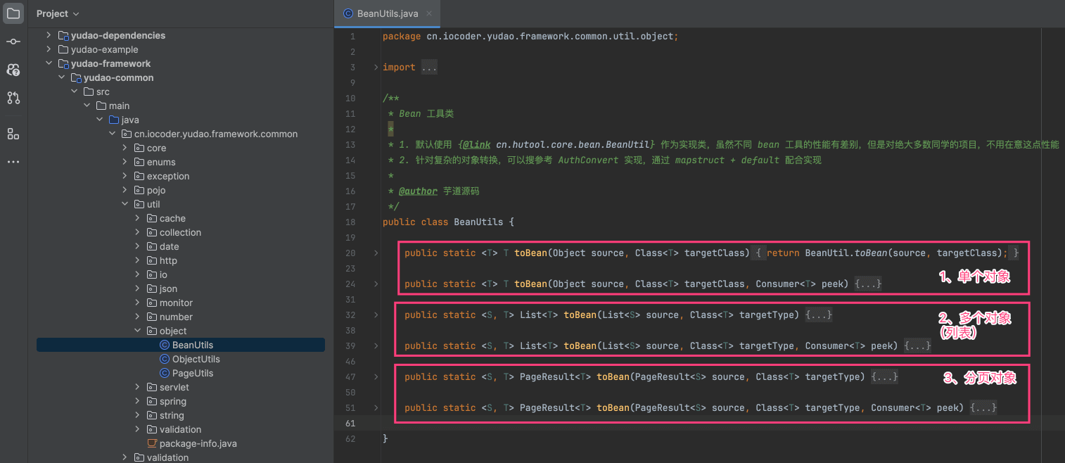 项目提供了 BeanUtils (opens new window) 类,它是基于 Hutool 的 BeanUtil 封装一层。如下图所示: