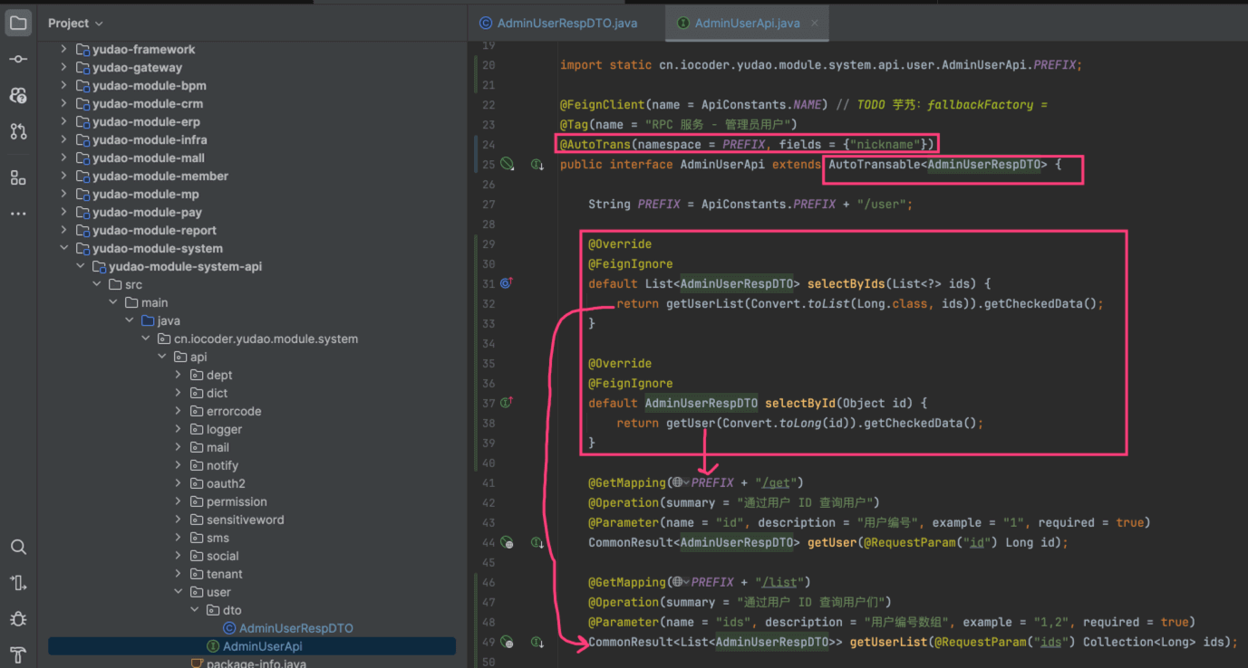 ② 第二步,给 AdminUserApi 实现 com.fhs.trans.service.AutoTransable 接口,并实现对应的 #selectByIds(...) 和 #selectById(...) 方法,还要添加 @AutoTrans 注解,如下图所示: