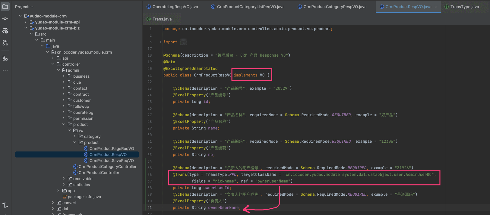 ② 第二步,给 CrmProductRespVO 的 ownerUserId 字段,添加 @Trans 注解,如下图所示: