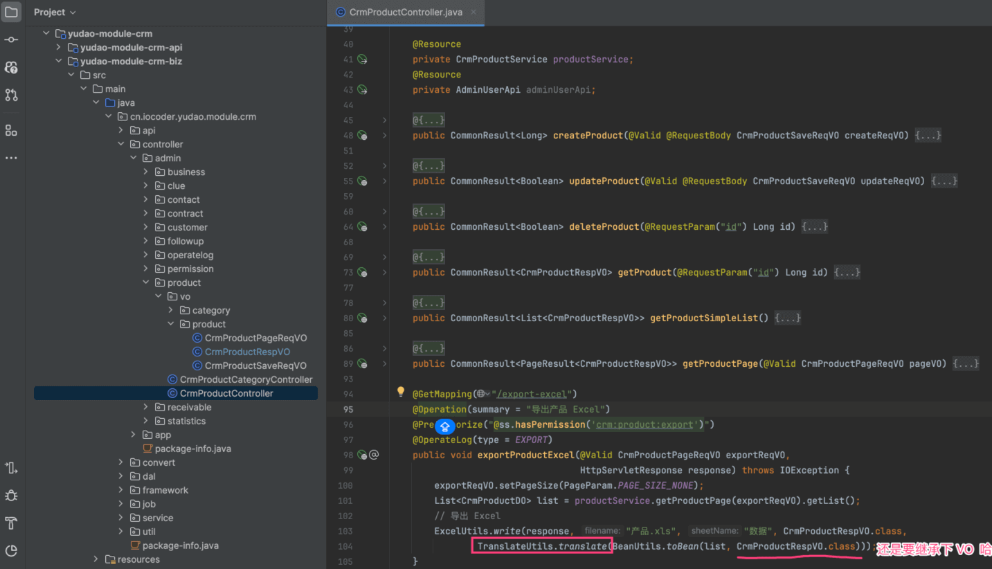 跨服务翻译,指的是在不同服务,通过 RPC 进行数据翻译。例如说,CrmProductRespVO 属于 xcmd-module-crm 服务,需要读取 yudao-module-system 服务的 AdminUserRespDTO 数据。