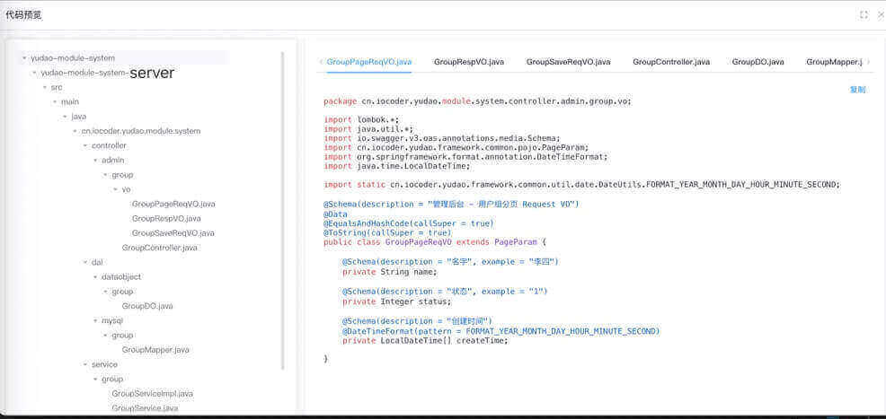 点击 system_group 所在行的 [预览] 按钮,在线预览生成的代码,检查是否符合预期。