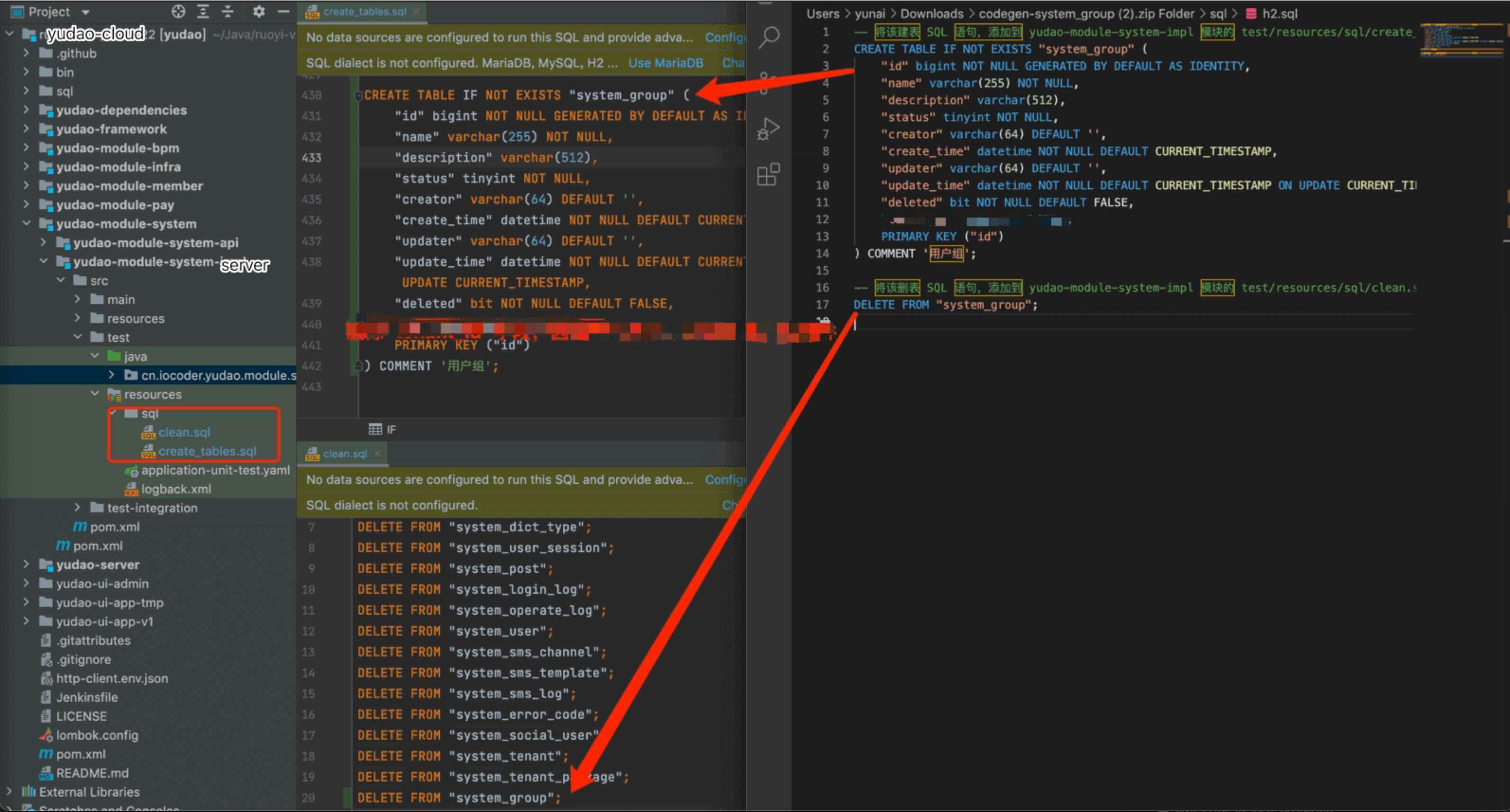 ③ (可选,默认关闭,一般可不操作)将 h2.sql 的 CREATE 语句复制到该模块的 create_tables.sql 文件,DELETE 语句复制到该模块的 clean.sql。操作如下图: