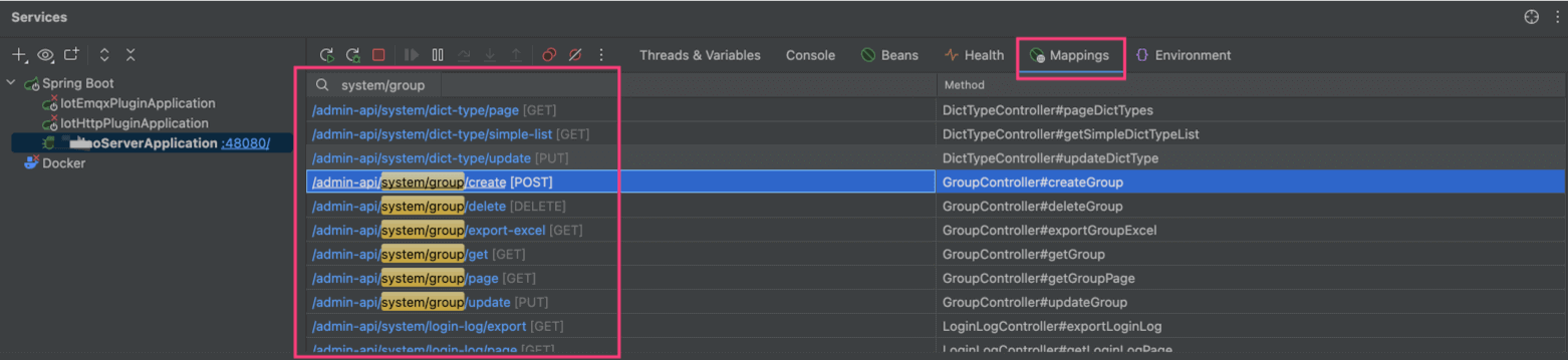 ⑤ Debug 运行 SystemServerApplication 类,启动后端项目。通过 IDEA 的 [Mappings] 菜单,可以看到代码生成的 GroupController 的 RESTful API 接口已经生效。