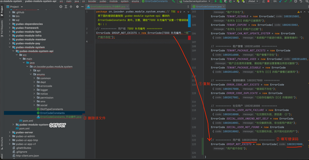 ② 将 ErrorCodeConstants.java_手动操作 文件的错误码,复制到该模块 ErrorCodeConstants 类中,并设置对应的错误码编号,之后进行删除。操作如下图所示:
