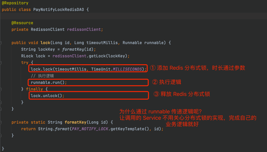 ② 创建 PayNotifyLockRedisDAO (opens new window)类,使用 RedisClient 实现分布式锁的加锁与解锁。如下图所示: