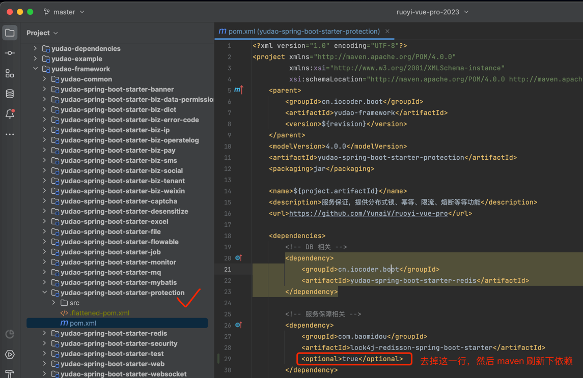 考虑到不是所有人都会使用 Lock4j 组件,所以默认项目未引入 lock4j-redisson-spring-boot-starter。如果你想要实用,可按照下图进行引入:
