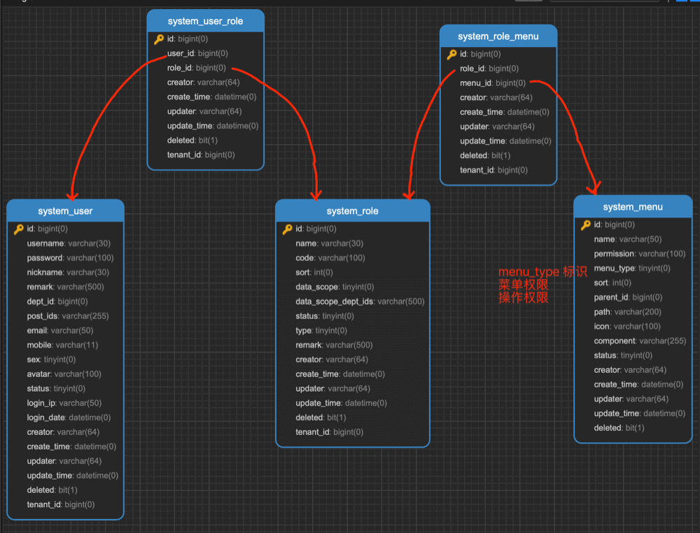 简单来说,每个用户拥有若干角色,每个角色拥有若干个菜单,菜单中存在菜单权限、按钮权限。这样,就形成了 “用户<->角色<->菜单” 的授权模型。 在这种模型中,用户与角色、角色与菜单之间构成了多对多的关系,如下图:
