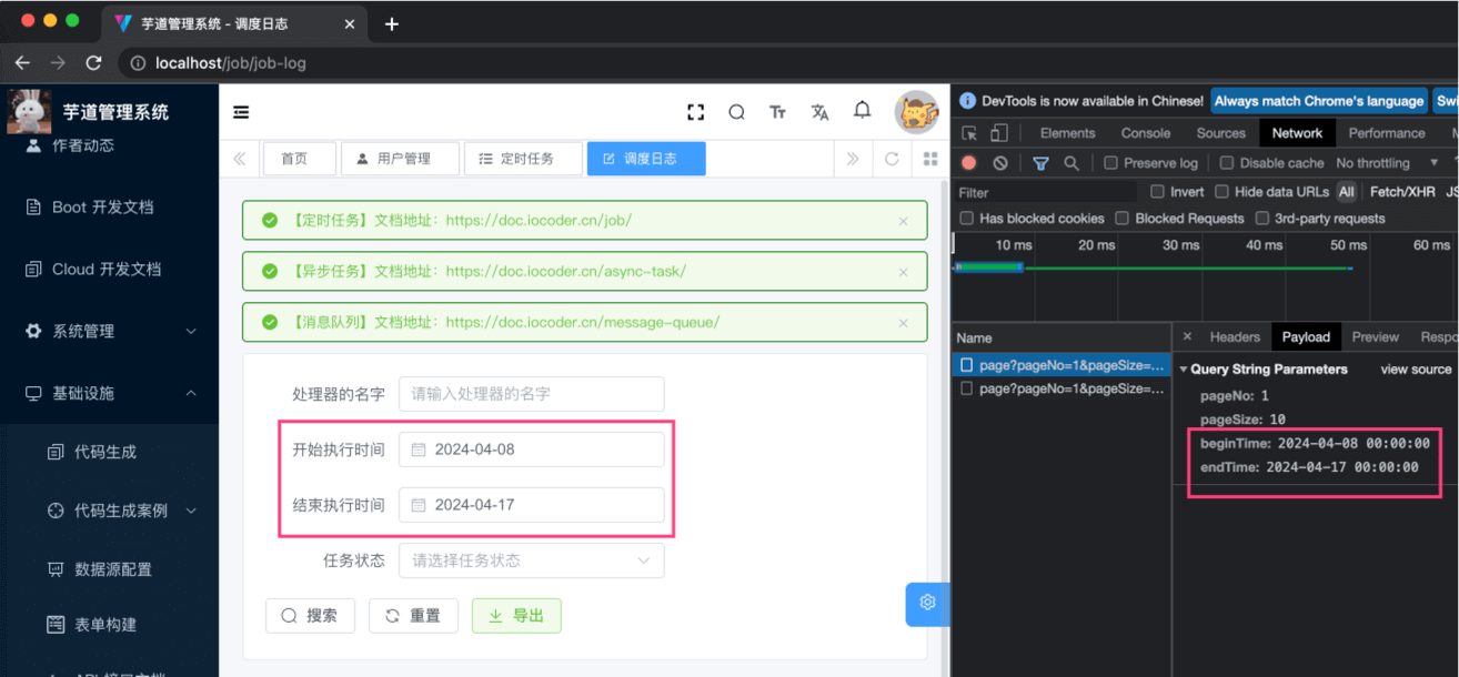 - views/infra/job/logger/index.vue 的beginTime或endTime参数: