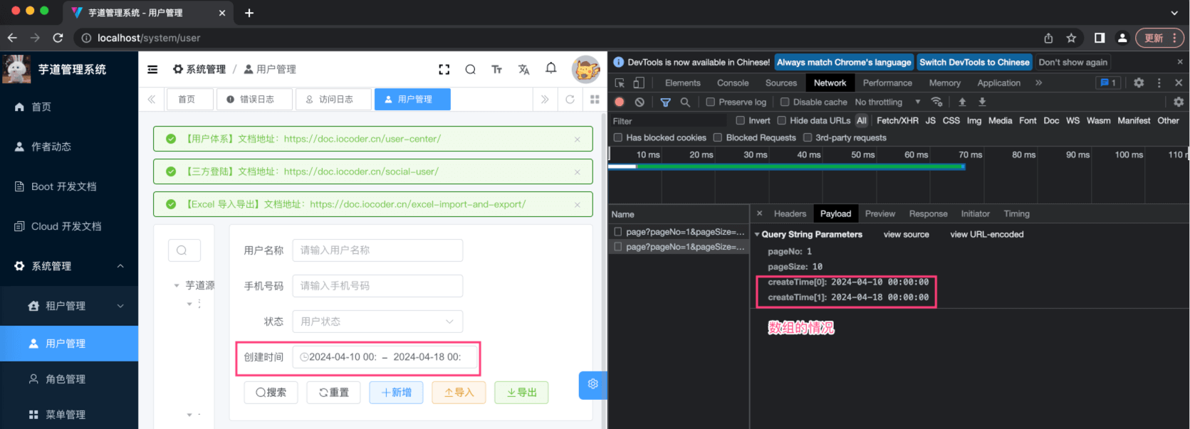 ② 前端传递时间参数时,需要时间格式为 Long 时间戳。例如说: