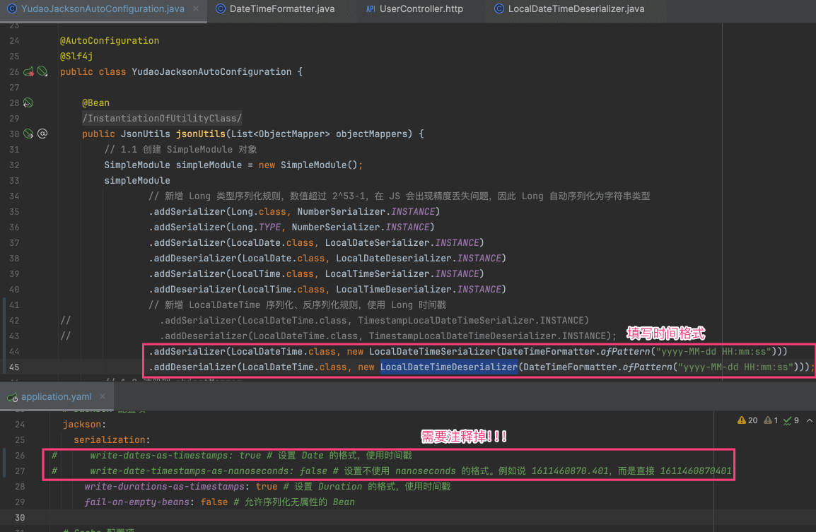 如果你想 JSON 全局配置成 yyyy-MM-dd HH:mm:ss 或其它时间格式,通过使用 Jackson 内置的 LocalDateTimeSerializer 和 LocalDateTimeDeserializer 即可,如下图所示: