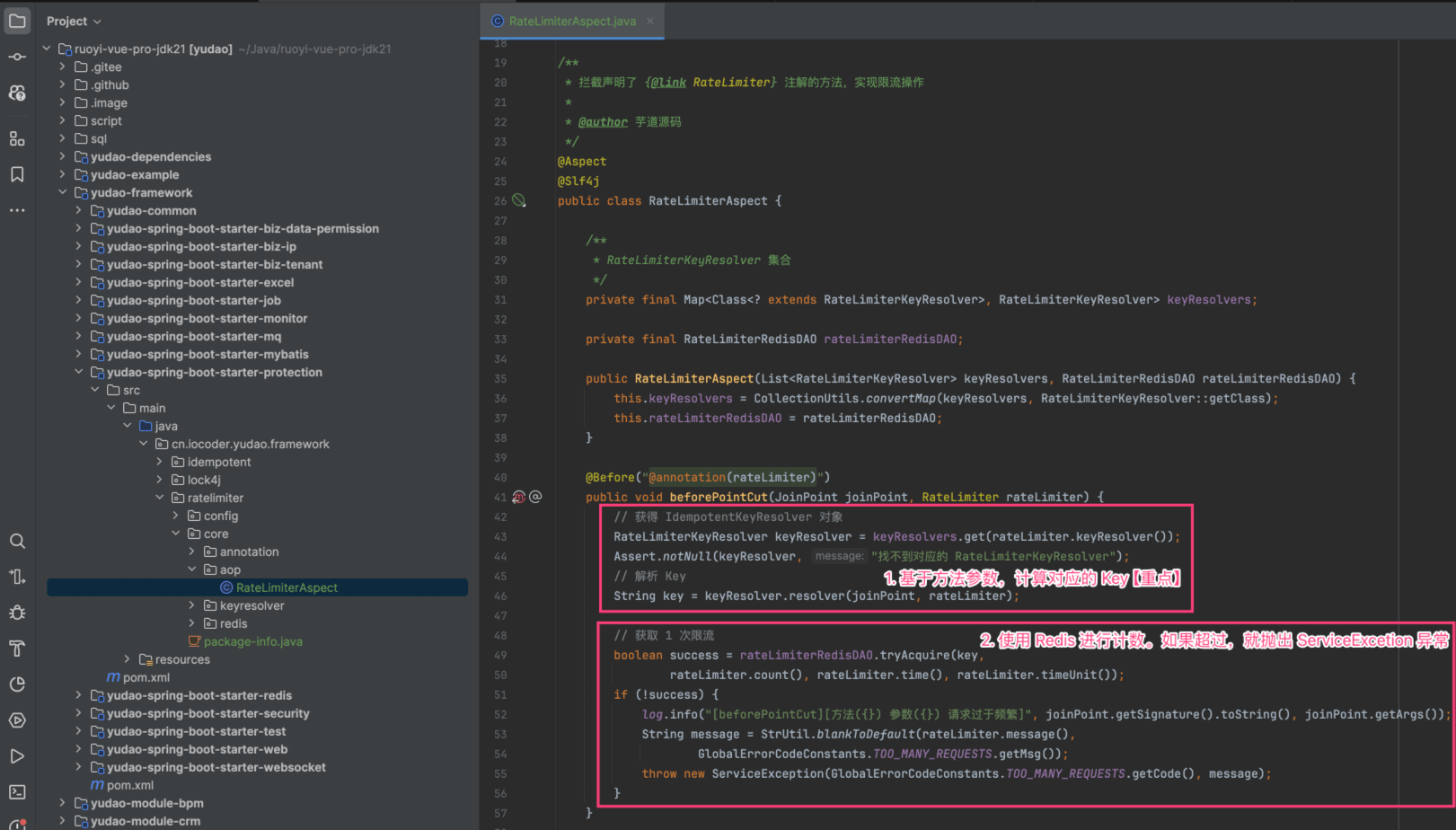 ① 对应的 AOP 切面是 RateLimiterAspect (opens new window) 类,核心就 10 行左右的代码,如下图所示: