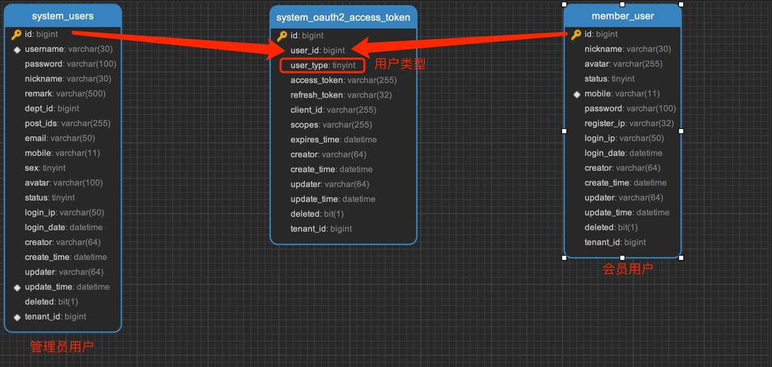 如果表需要关联多种类型的用户,例如说上述的 system_oauth2_access_token 访问令牌表,可以通过 user_type