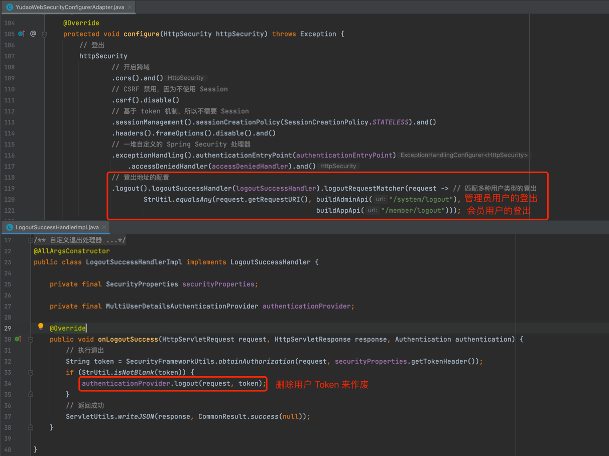 用户登出的功能,统一使用 Spring Security 框架,通过删除用户 Token 的方式来实现。代码如下: