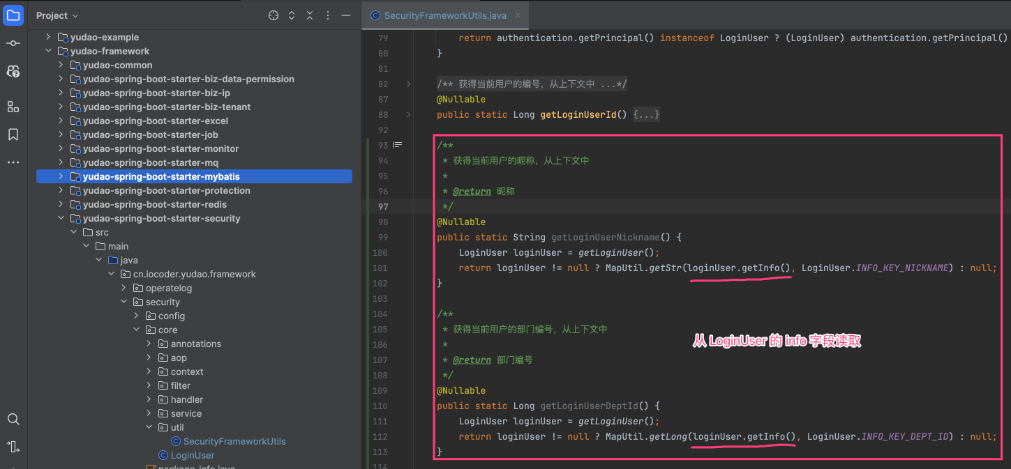 ② 在 SecurityFrameworkUtils 新增对应的 getXXX() 静态方法,参考如下图所示: