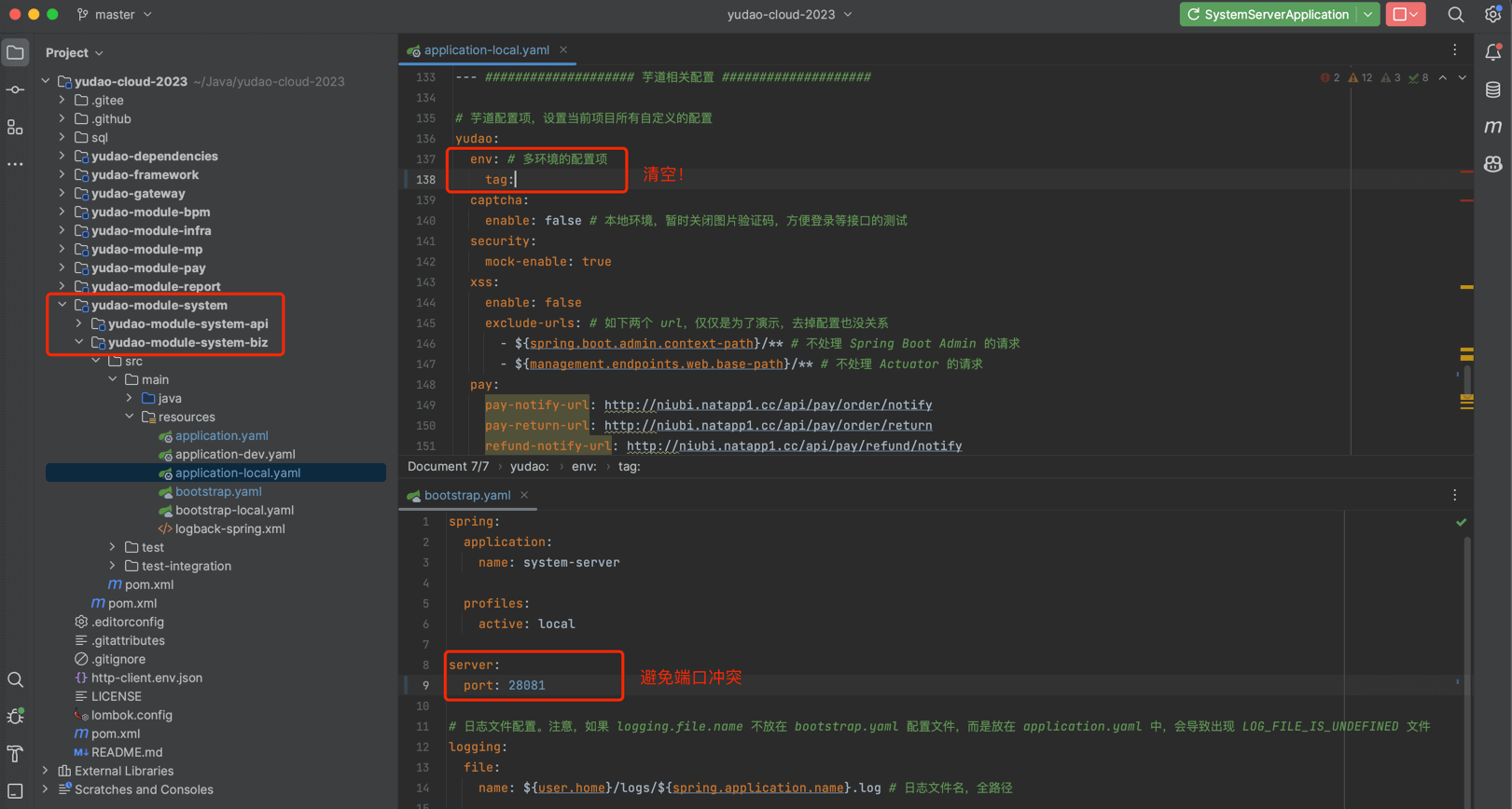 ① 修改 system 服务的端口为 28081,yudao.env.tag配置项为空。如下图所示: