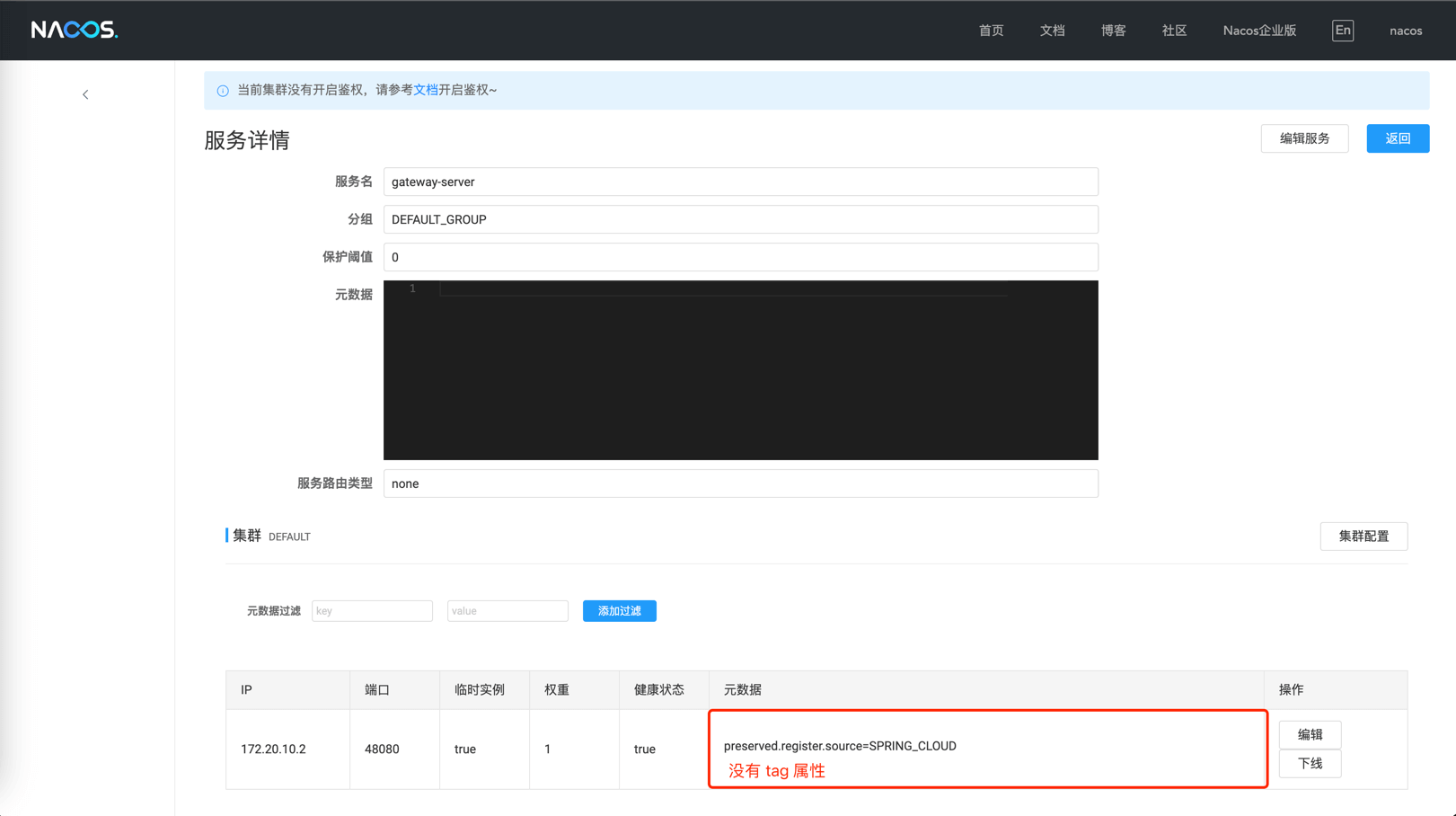直接运行 GatewayServerApplication 类,启动 gateway 服务。此时,我们可以在 Nacos 看到该实例,它是没tag 属性。如下图所示: