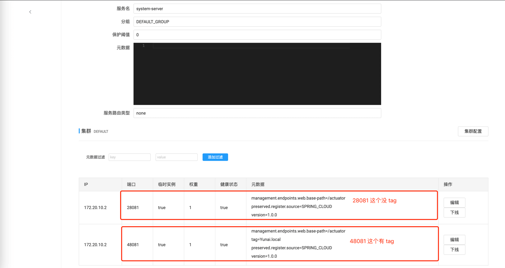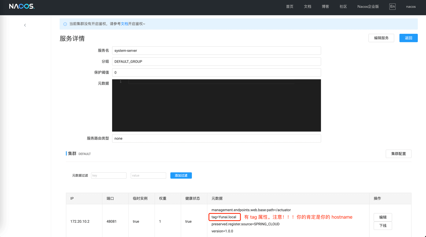 运行 SystemServerApplication 类,启动 system 服务。此时,我们可以在 Nacos 看到该实例,它是有 tag属性。如下图所示: