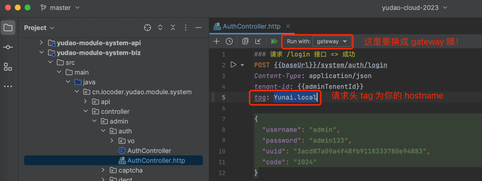 ① 打开AuthController.http文件,设置第一个请求的tag 为Yunai.local(要替换成你的 hostname),如下图所示: