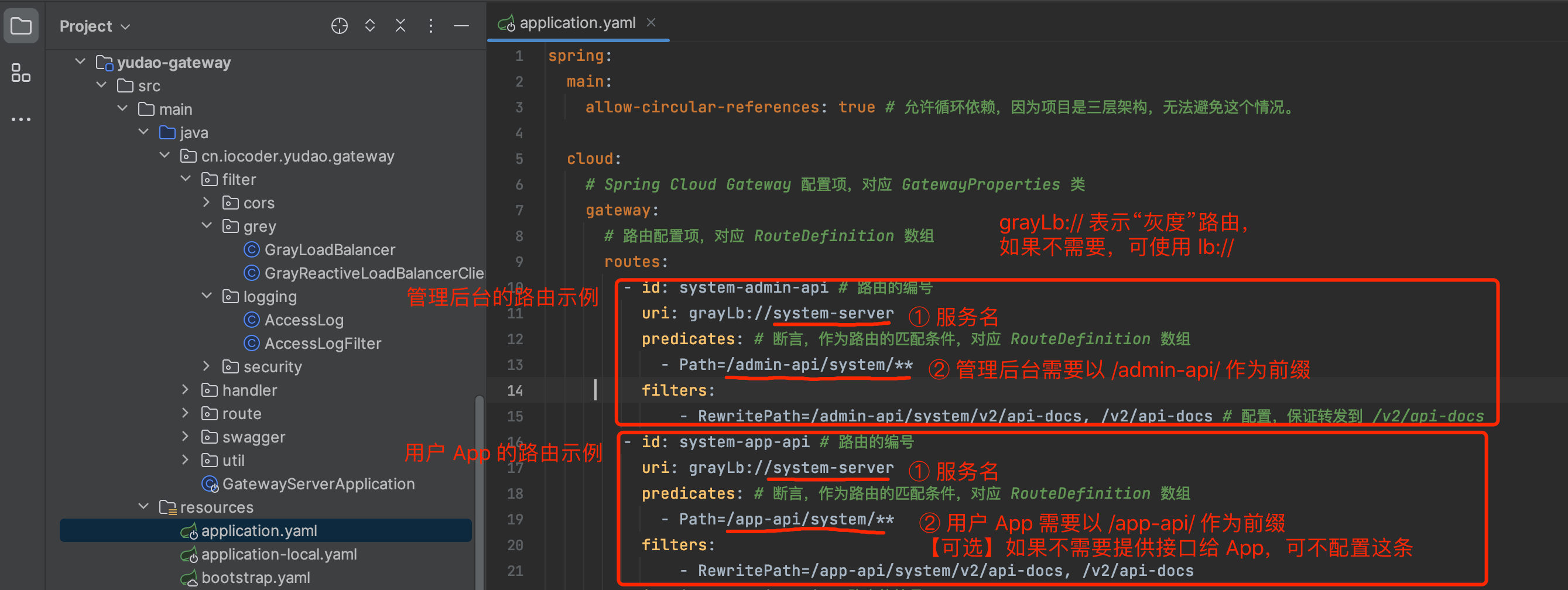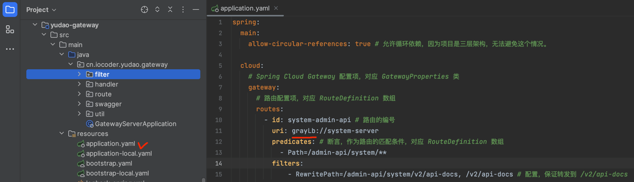 ① 第一步,【网关】配置服务的路由配置使用 grayLb:// 协议,指向灰度服务。例如说: