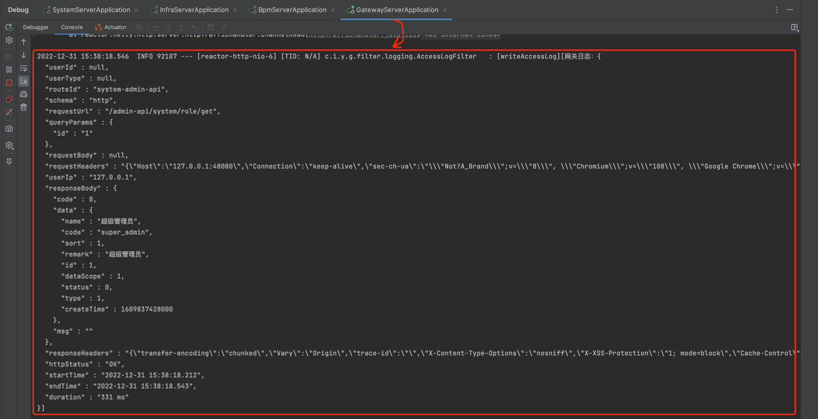 每次收到 HTTP 请求时,会打印访问日志,包括 Request、Response、用户等信息。如下图所示: