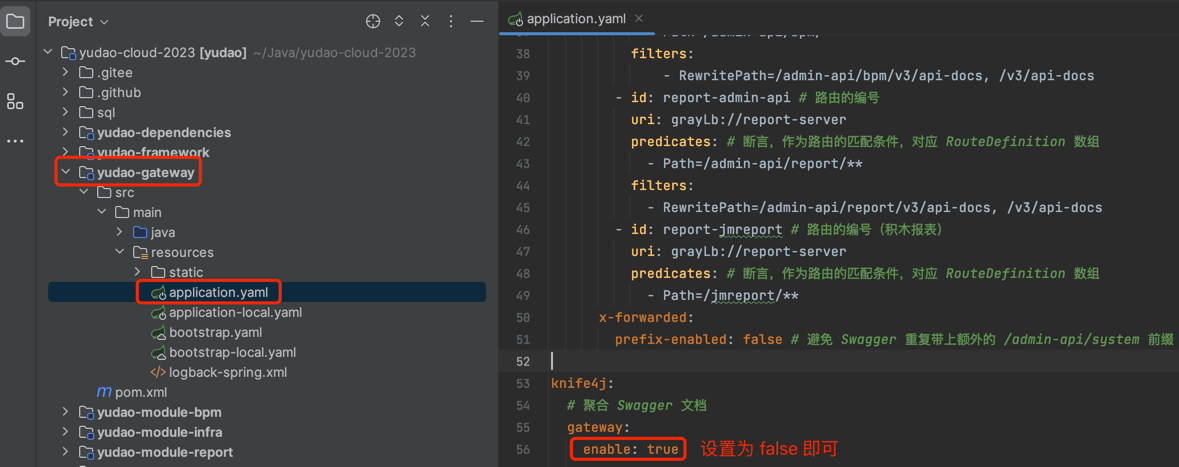 如果想要禁用 Swagger 功能,可通过 knife4j.gateway.enabled 配置项为 false。一般情况下,建议 prod 生产环境进行禁用,避免发生安全问题。