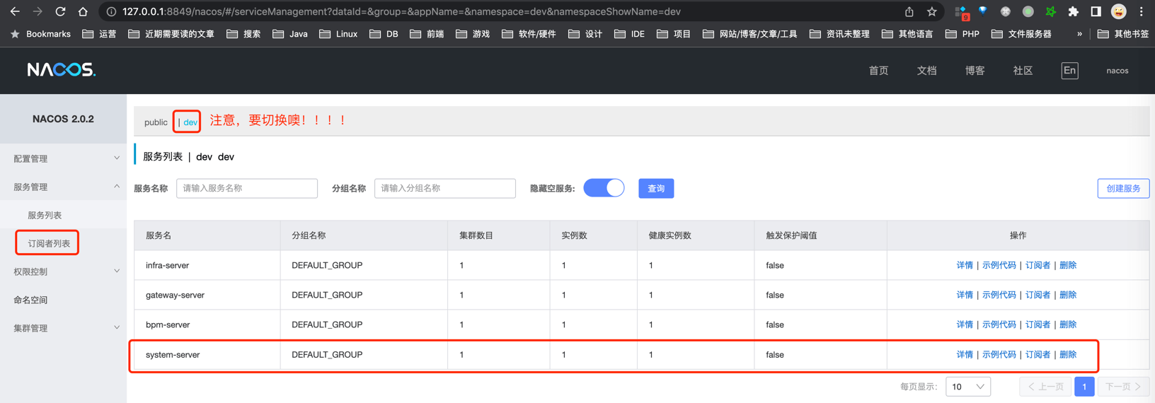 spring.cloud.nacos.discovery.namespace配置项:设置为 dev,就是刚创建的命名空间