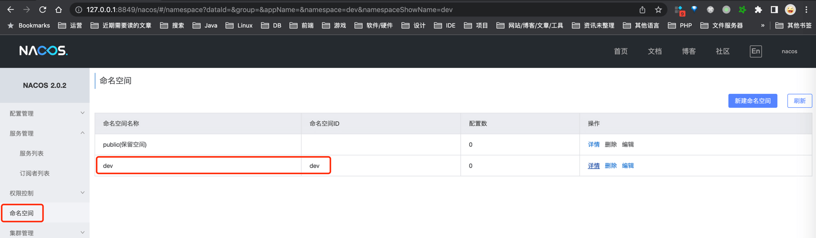 注意!新建命名空间时,它的“命名空间ID”、“命名空间名”都要是dev噢!!!