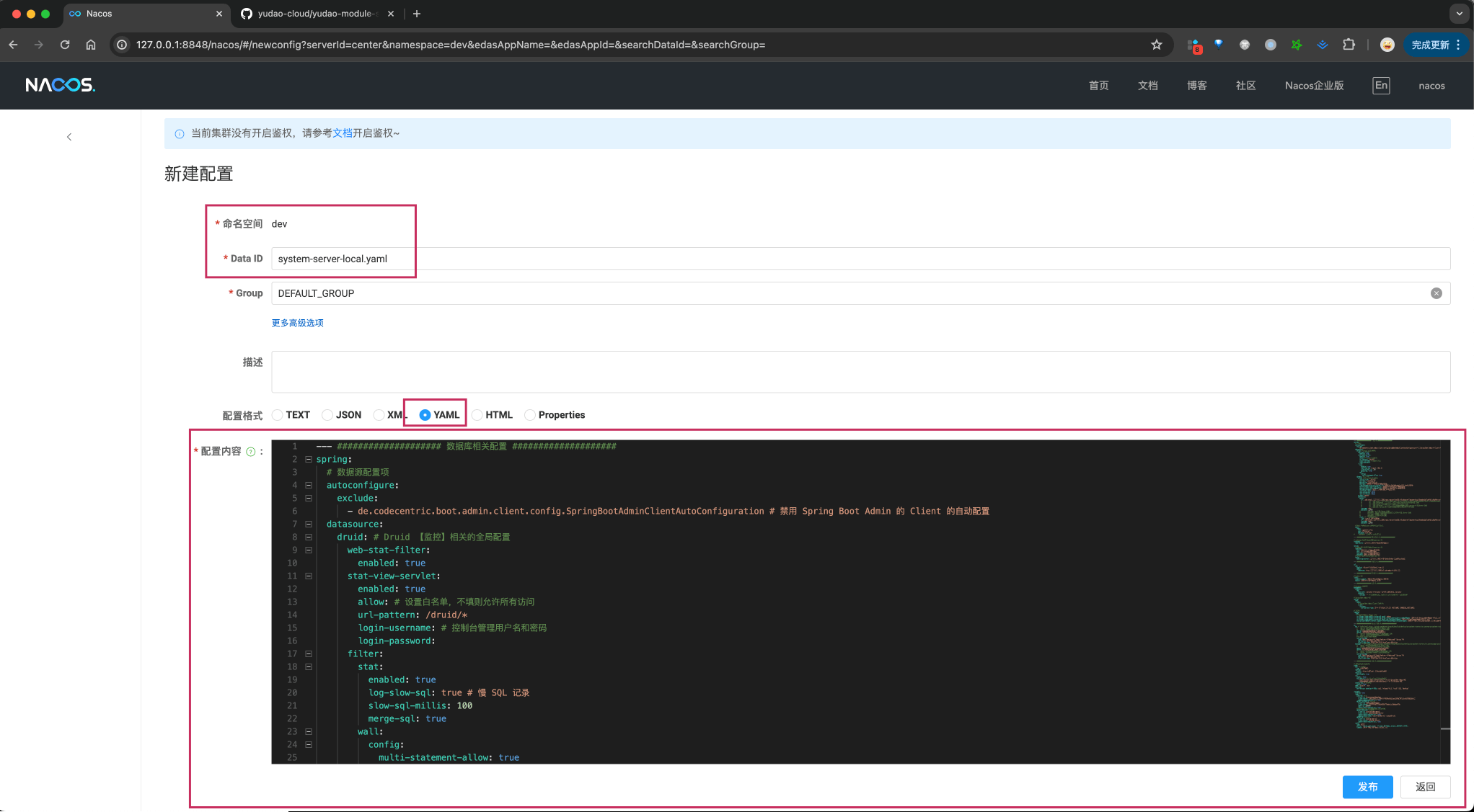Data ID为${spring.application.name}-${spring.profiles.active}.yaml,例如说 system-server-local.yaml。- 配置格式: