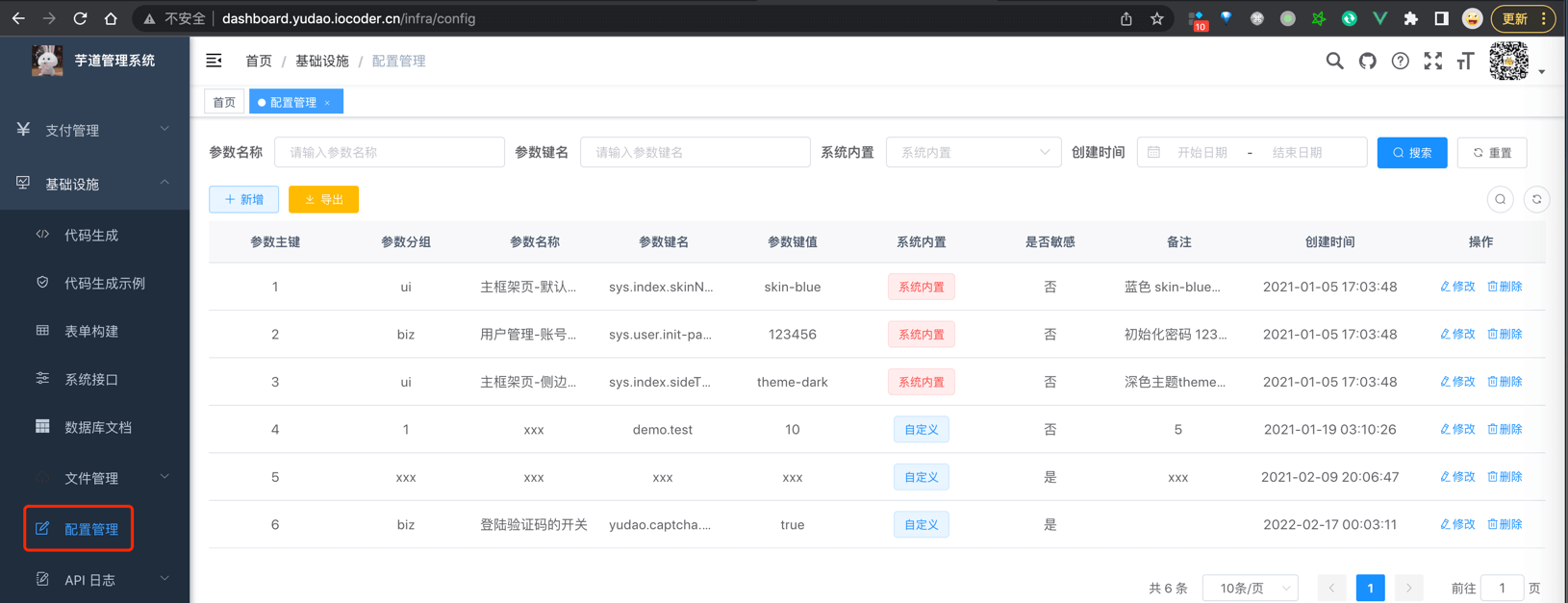 友情提示:该功能是从 Boot 项目延用到 Cloud 项目,一般情况下不会使用到,使用 Nacos 管理配置即可。在 [基础设施 -> 配置管理] 菜单,可以查看和管理配置,适合业务上需要动态的管理某个配置。