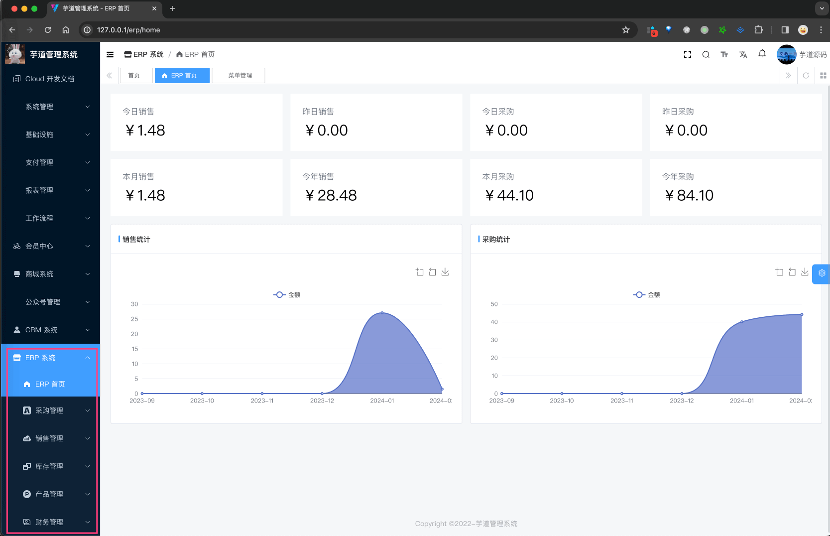② 然后,访问前端的 ERP 菜单,确认功能是否生效。如下图所示: