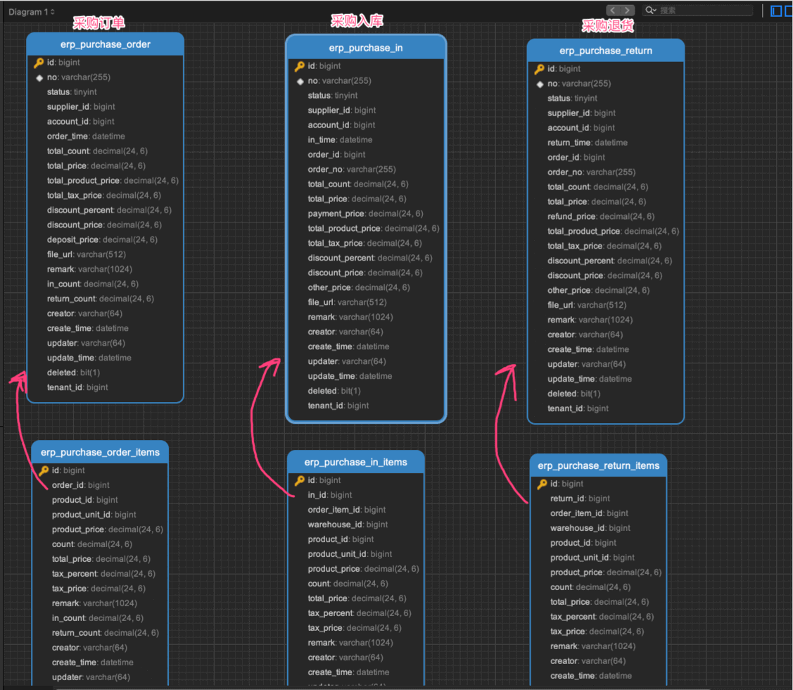 erp_purchase_order 表和 erp_purchase_order_items 表,分别对应采购订单和采购订单项。