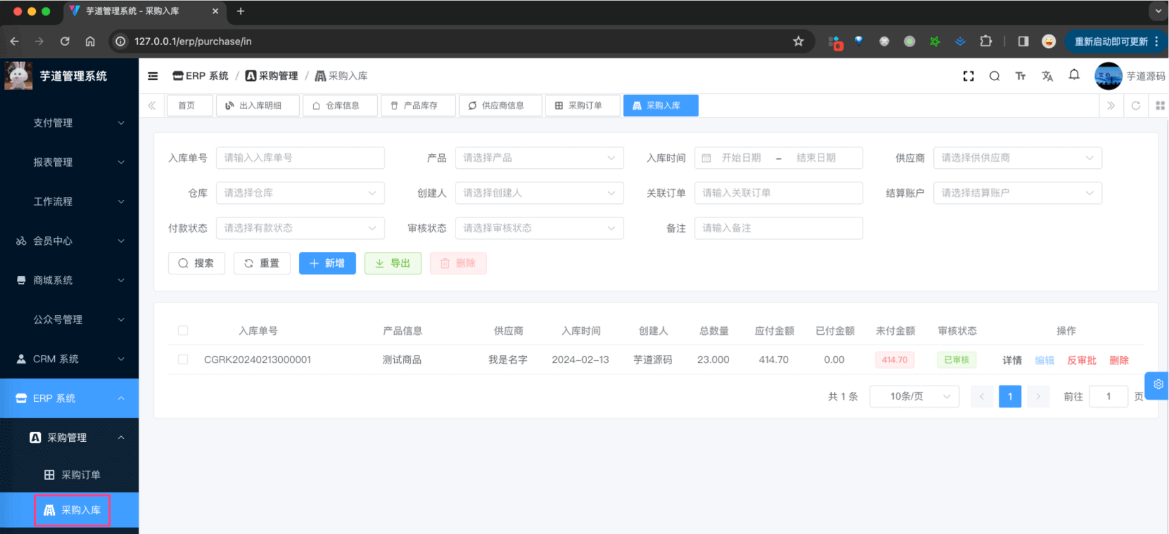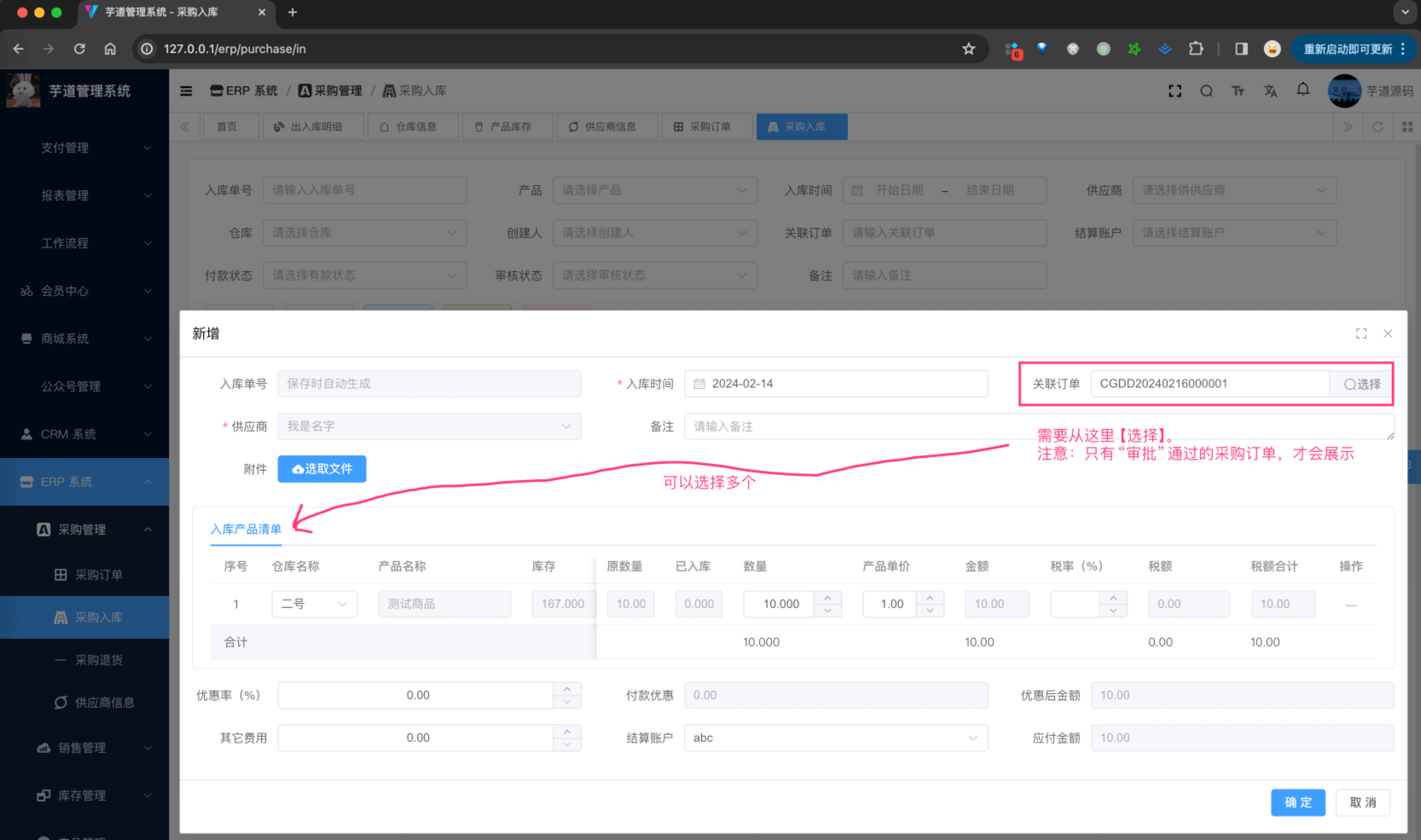采购入库,由 ErpPurchaseInController 提供接口,它会影响(增加)库存。总的来说,它的逻辑和 其它入库 基本一致,只是它是针对采购的入库。