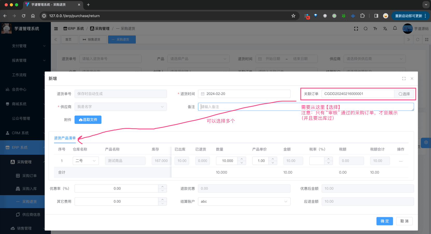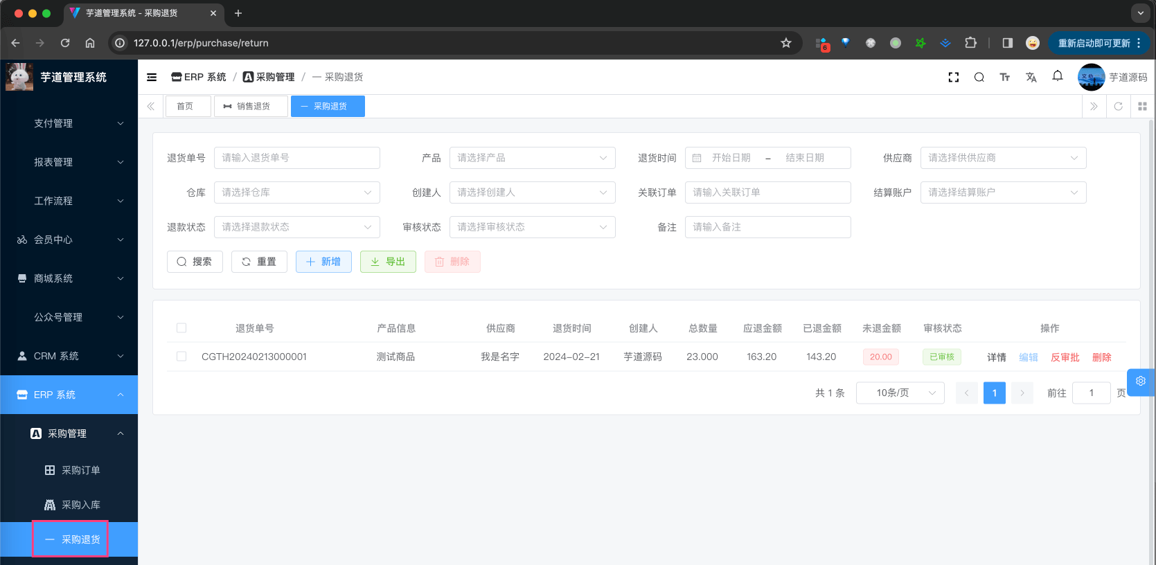采购退货,由 ErpPurchaseReturnController 提供接口,它会影响(减少)库存。总的来说,它的逻辑和 其它出库 基本一致,只是它是针对采购的出库。