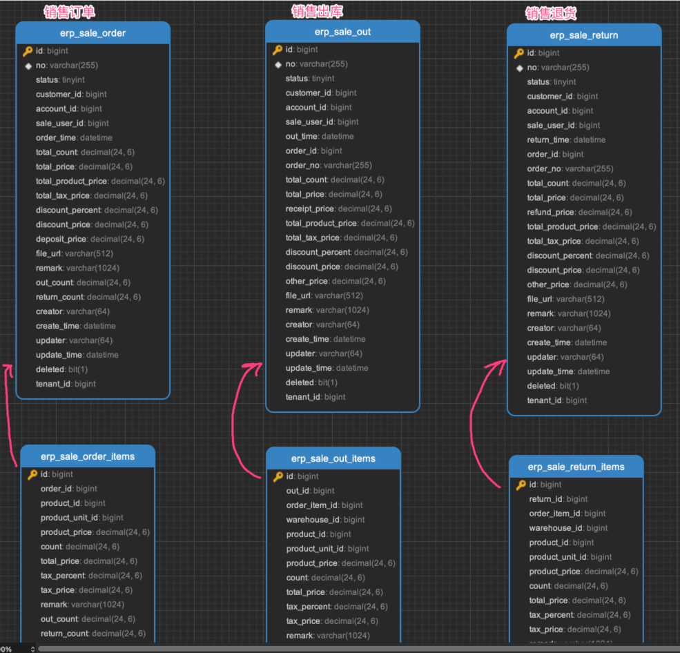 erp_sale_order 表和 erp_sale_order_items 表,分别对应销售订单和销售订单项。