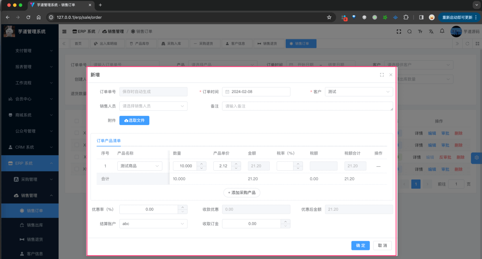 ① 点击「新增」按钮,随便填写一些信息,点击「确认」按钮,即可新增一条销售订单。