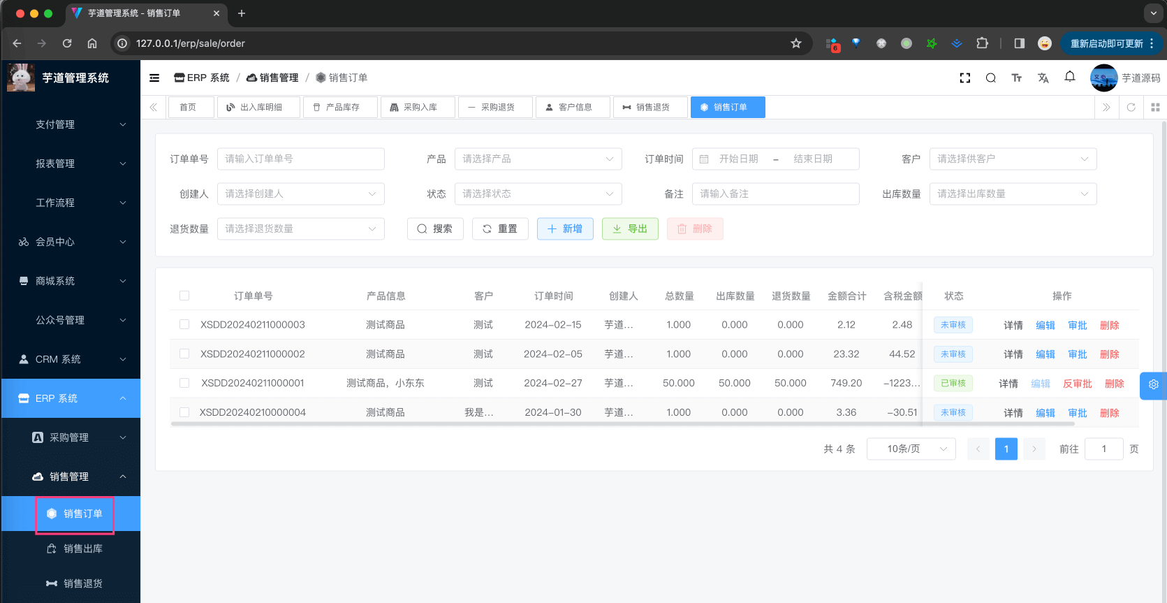 销售订单,由 ErpSaleOrderController 提供接口,它不会直接影响库存,只有在出库、退货等操作才会影响库存。