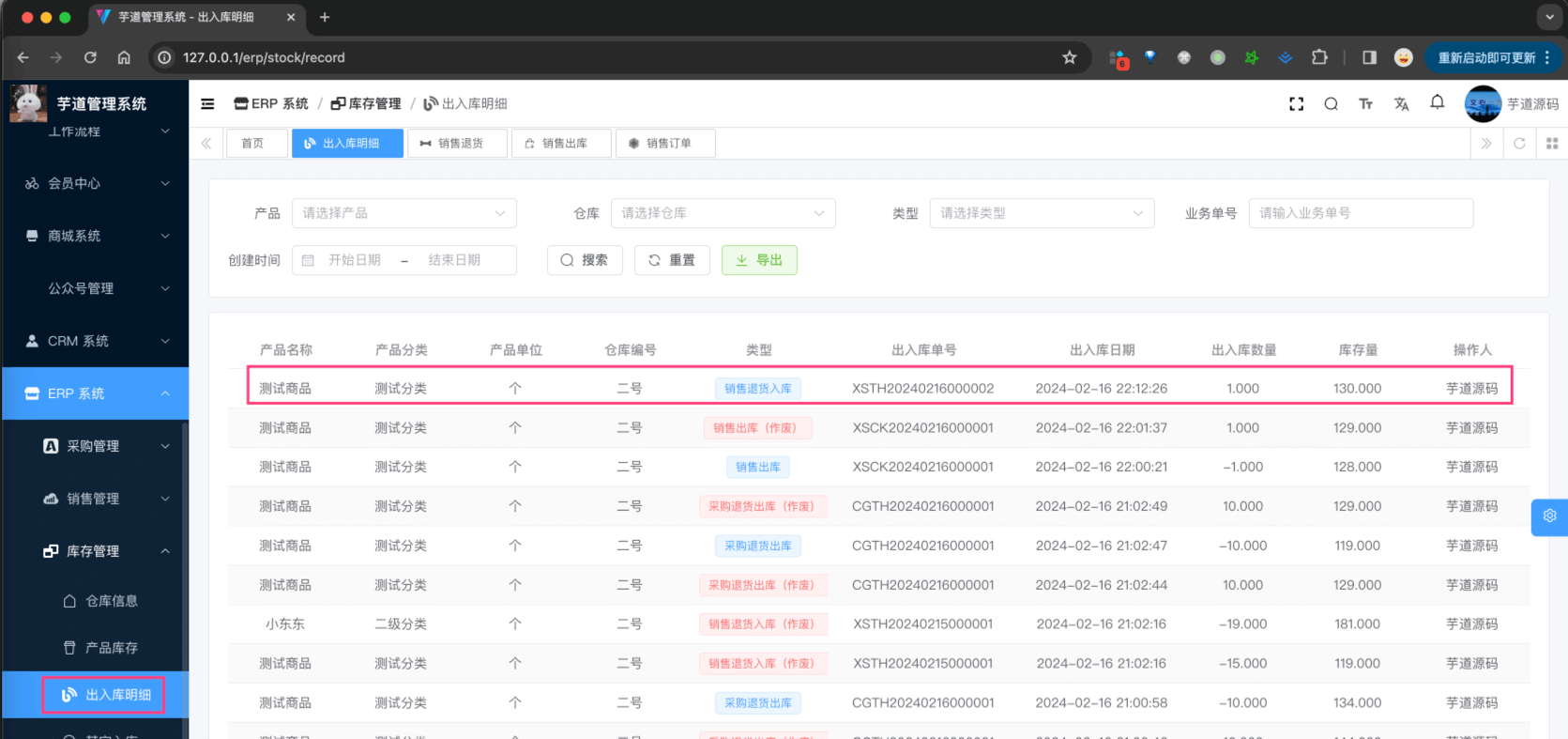 销售退货,由 ErpSaleReturnController 提供接口,它会影响(增加)库存。总的来说,它的逻辑和 其它入库 基本一致,只是它是针对销售的入库。