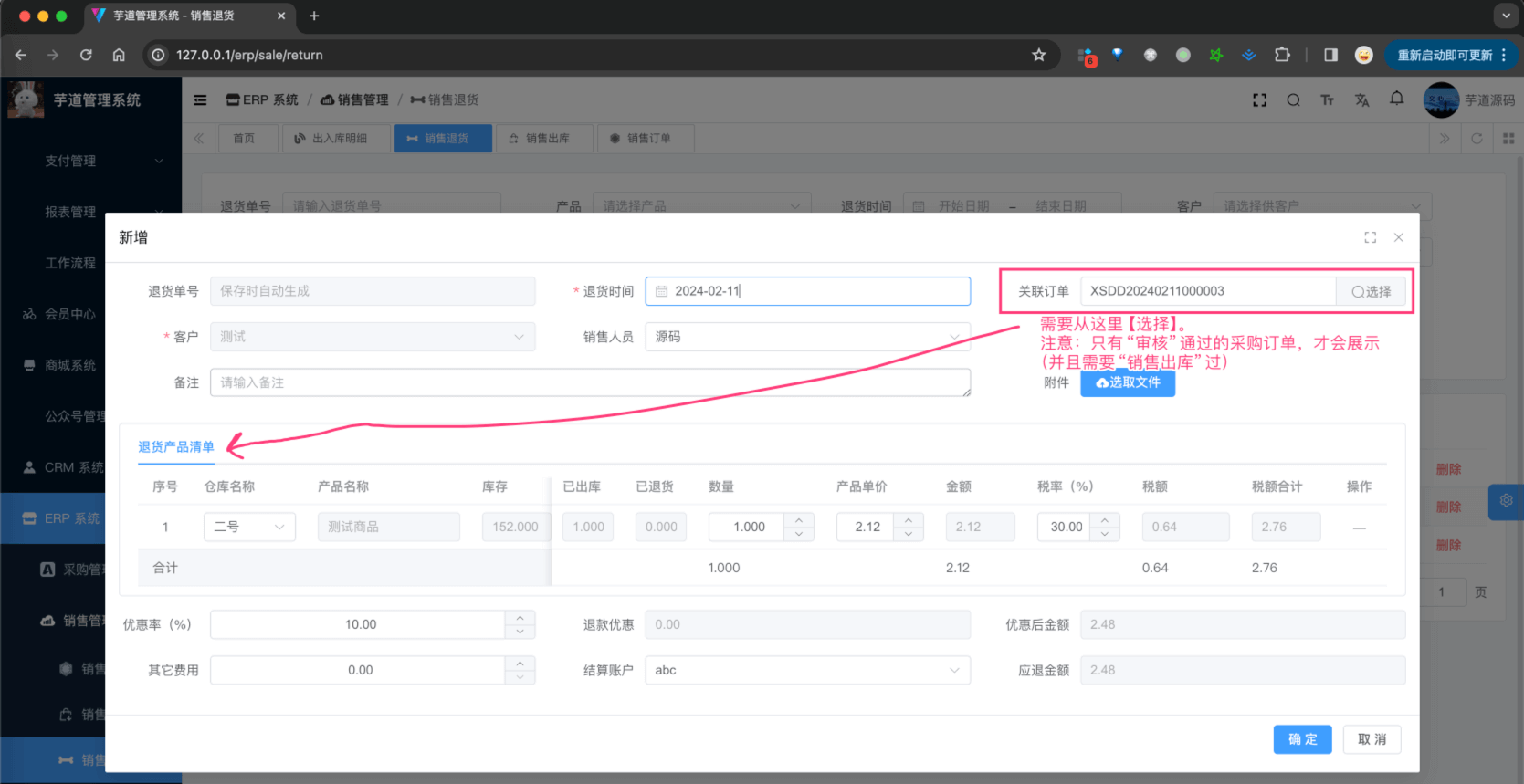 ① 点击「新增」按钮,随便填写一些信息,点击「确认」按钮,即可新增一条销售退货。