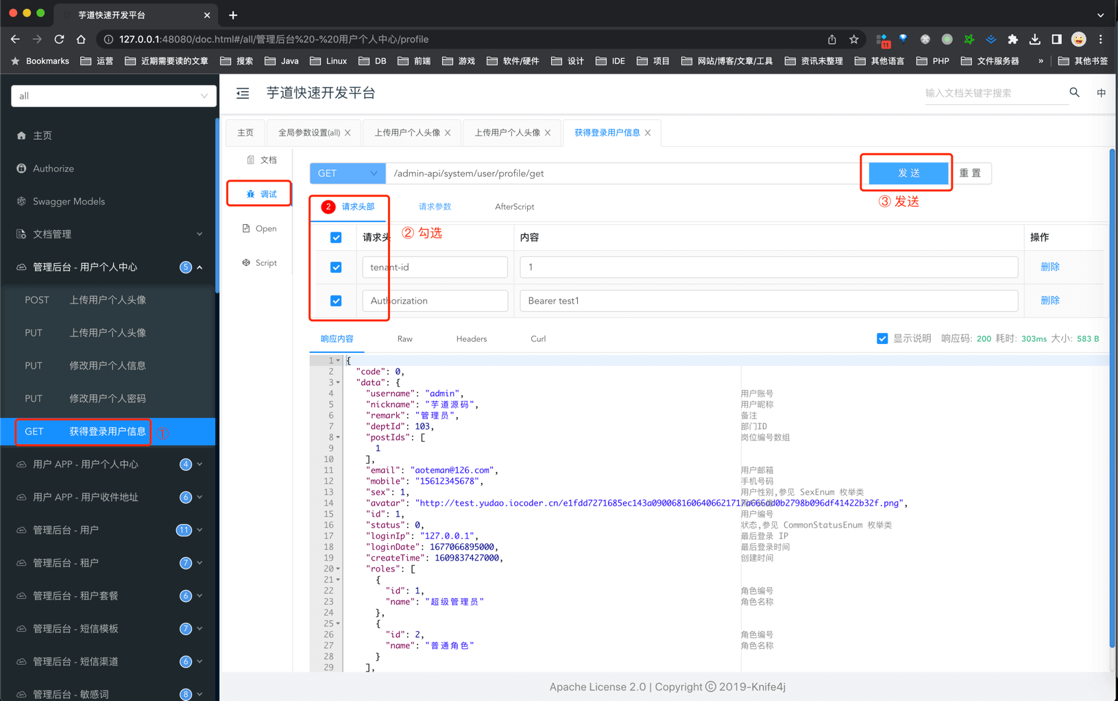 ① 点击任意一个接口,进行接口的调用测试。这里,使用「管理后台-用户个中心」的"获得登录用户信息"举例子。