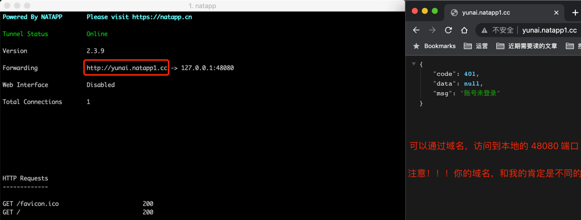 这里,我们使用 natapp 作为内网穿透工具,转发到后端的 48080 端口。
