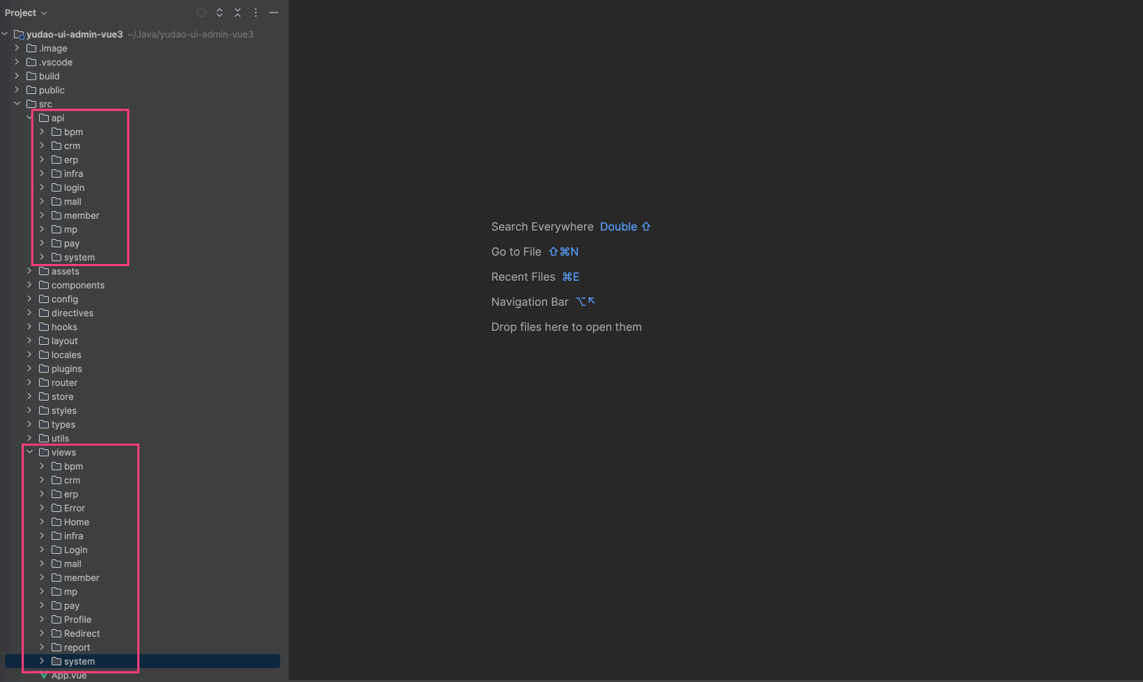 前端仓库,不区分 【完整版】 【精简版】 ,因为它本身就比较简单。只需要删除 api 和 views 下面对应的模块即可。如下图所示: