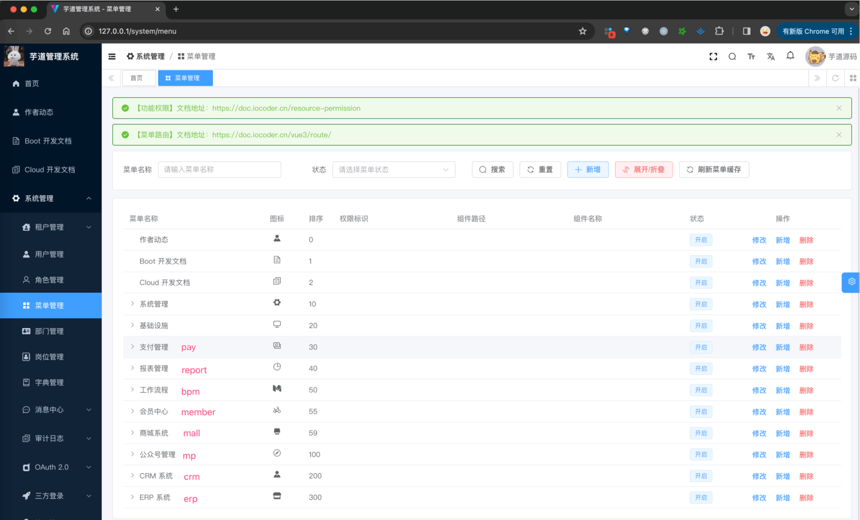 - 【完整版】:包括系统功能、基础设施、会员中心、数据报表、工作流程、商城系统、微信公众号、CRM、ERP 等功能
