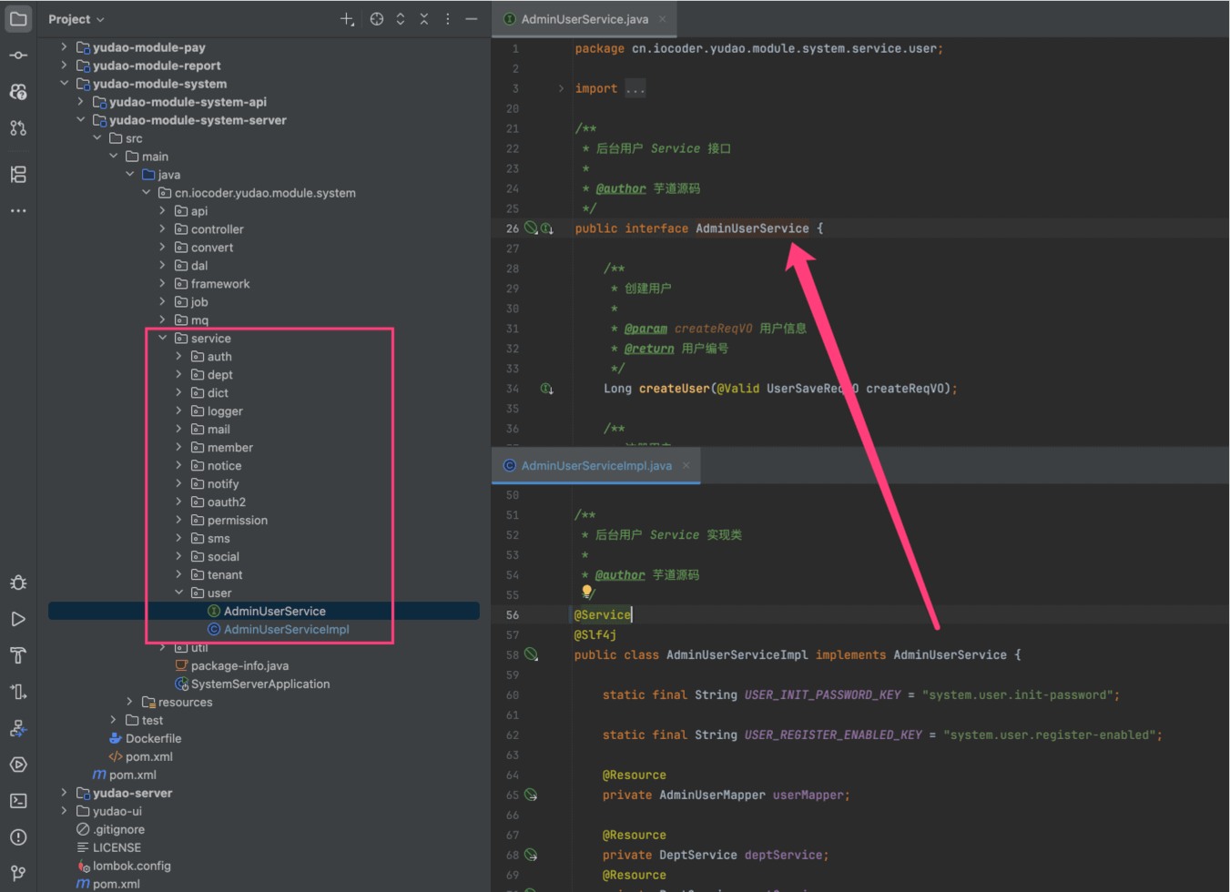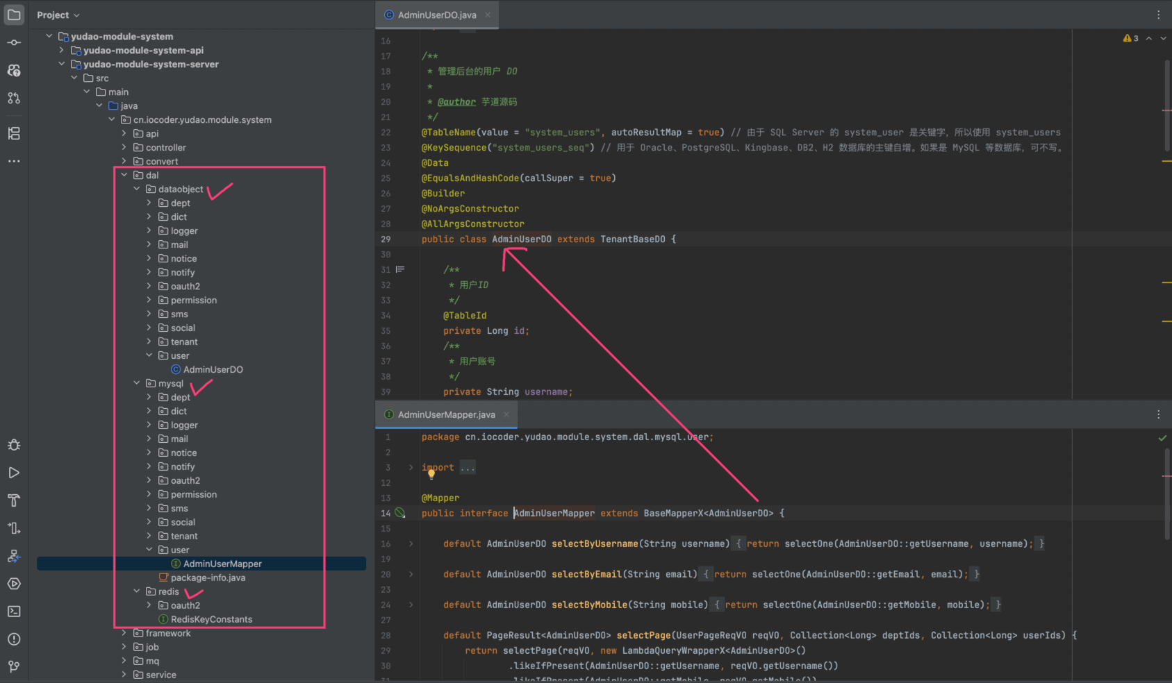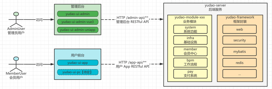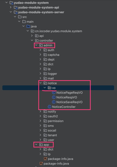 controller.admin | Controller 类 | 提供给管理后台的 RESTful API,默认以 admin-api 作为前缀。例如admin-api/system/auth/login 登录接口。 | AuthController |