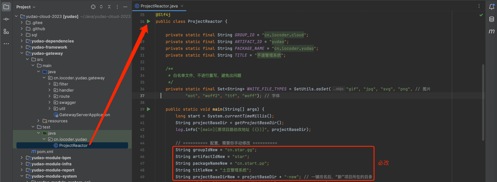 ② 第二步,打开 ProjectReactor 类,填写 groupIdNew、artifactIdNew、packageNameNew、titleNew 属性。如下图所示: